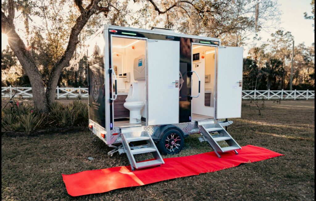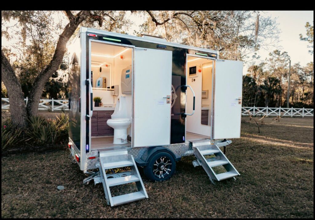Our modern restroom trailers feature flushing toilets, running water, heat & A/C, and elegant interiors — creating a clean, upscale experience for weddings, private parties, corporate gatherings, and more throughout Central Florida.